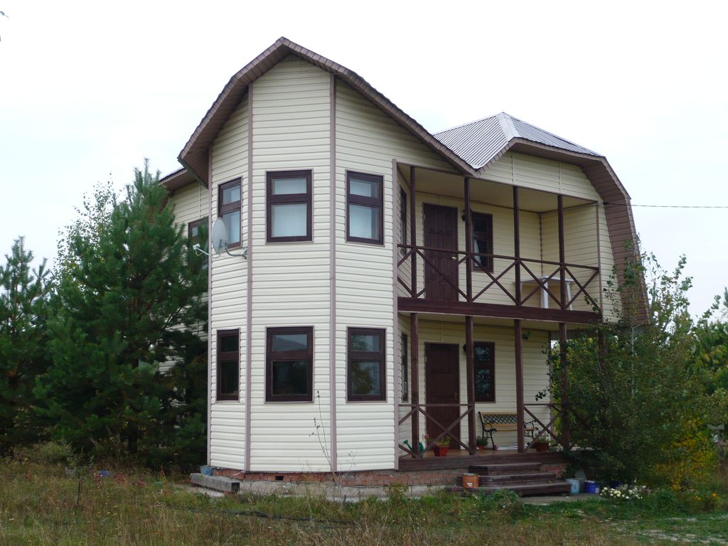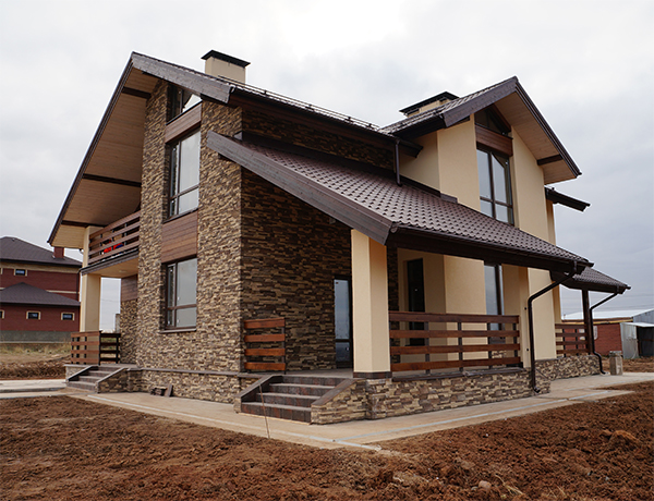 - Внешняя отделка стен дома (сайдинг, штукатурка, фасадный кирпич, декоративный камень и т. п.)